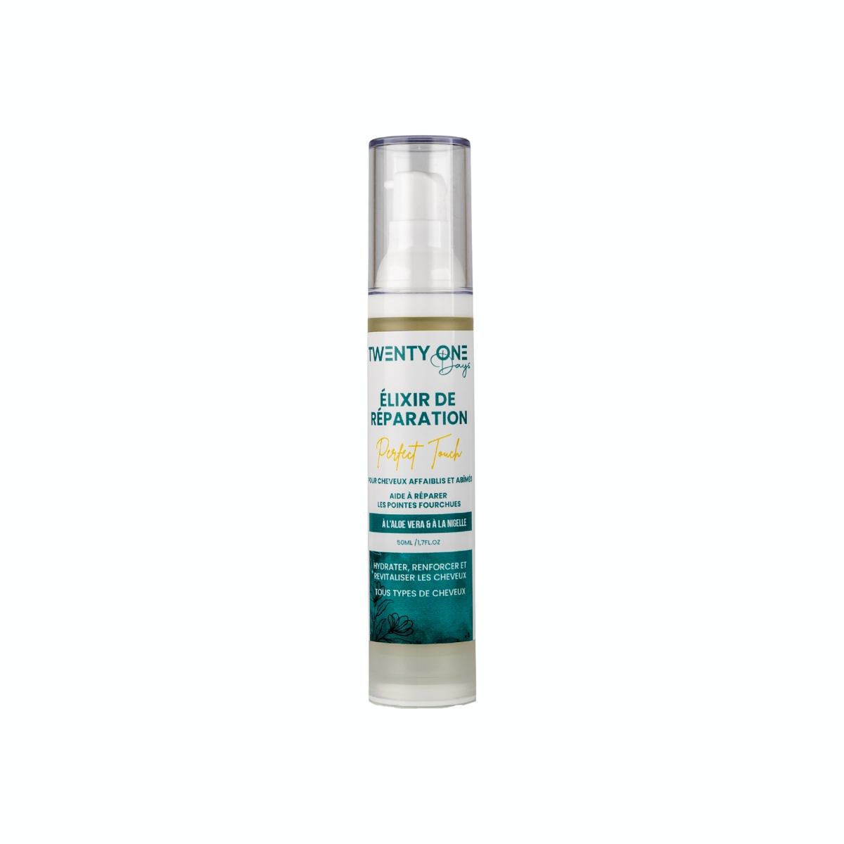 Je suis un élixir protecteur multi-actions conçu pour renforcer les pointes, protéger des appareils chauffants et lisser la chevelure. Il forme une barrière naturelle contre la casse, tout en apportant un éclat durable et une douceur soyeuse à chaque utilisation.